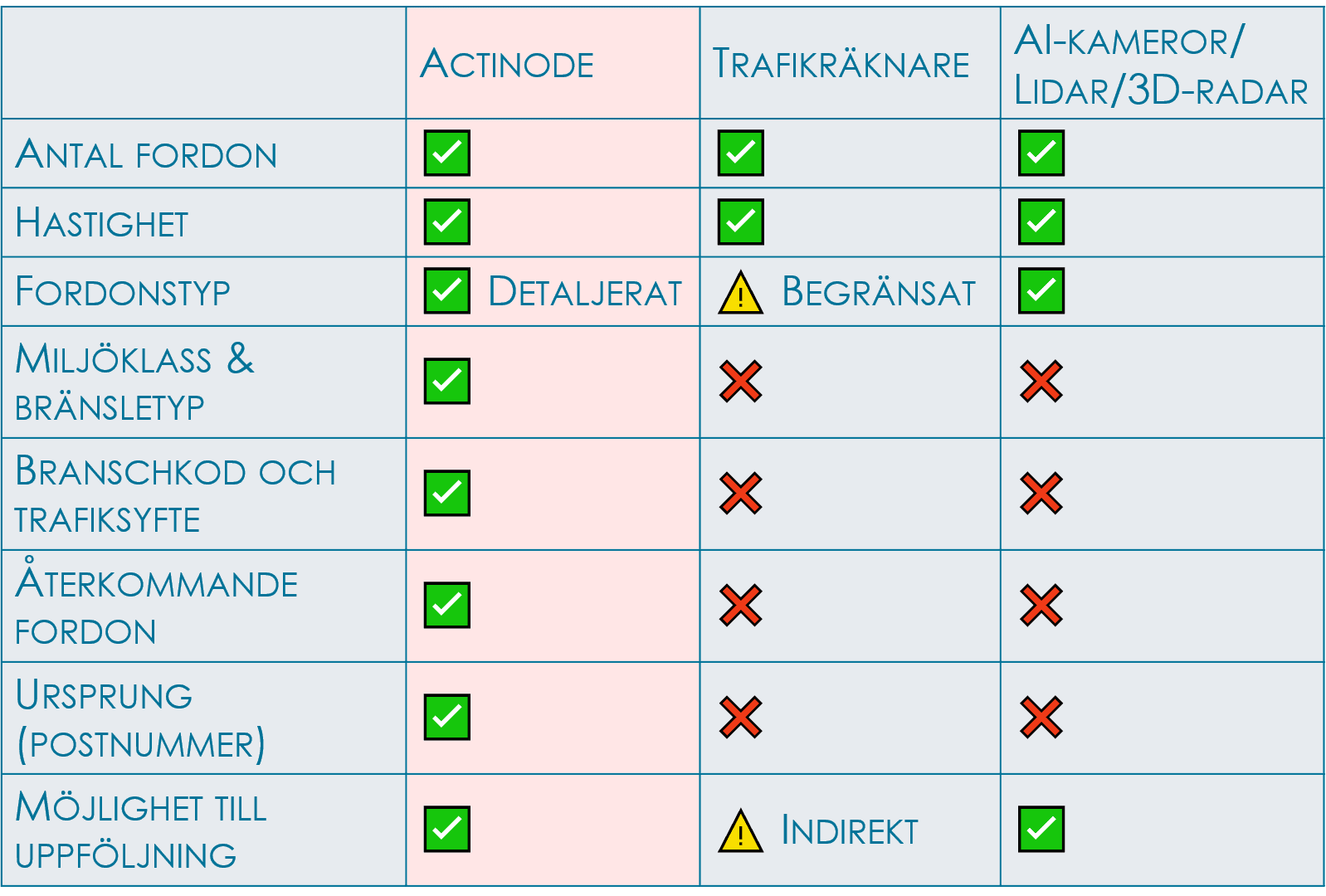 Pneumatiska slangar | Induktiva slingor | Actinode ANPR | AI-objektigenkänning | Radar | |